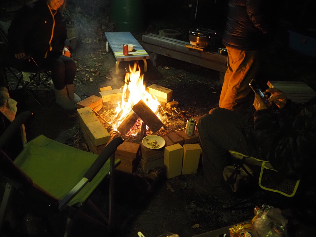 キャンプ仲間のお一人が差し入れとともに日帰りで来てくれて5人で焚火談義