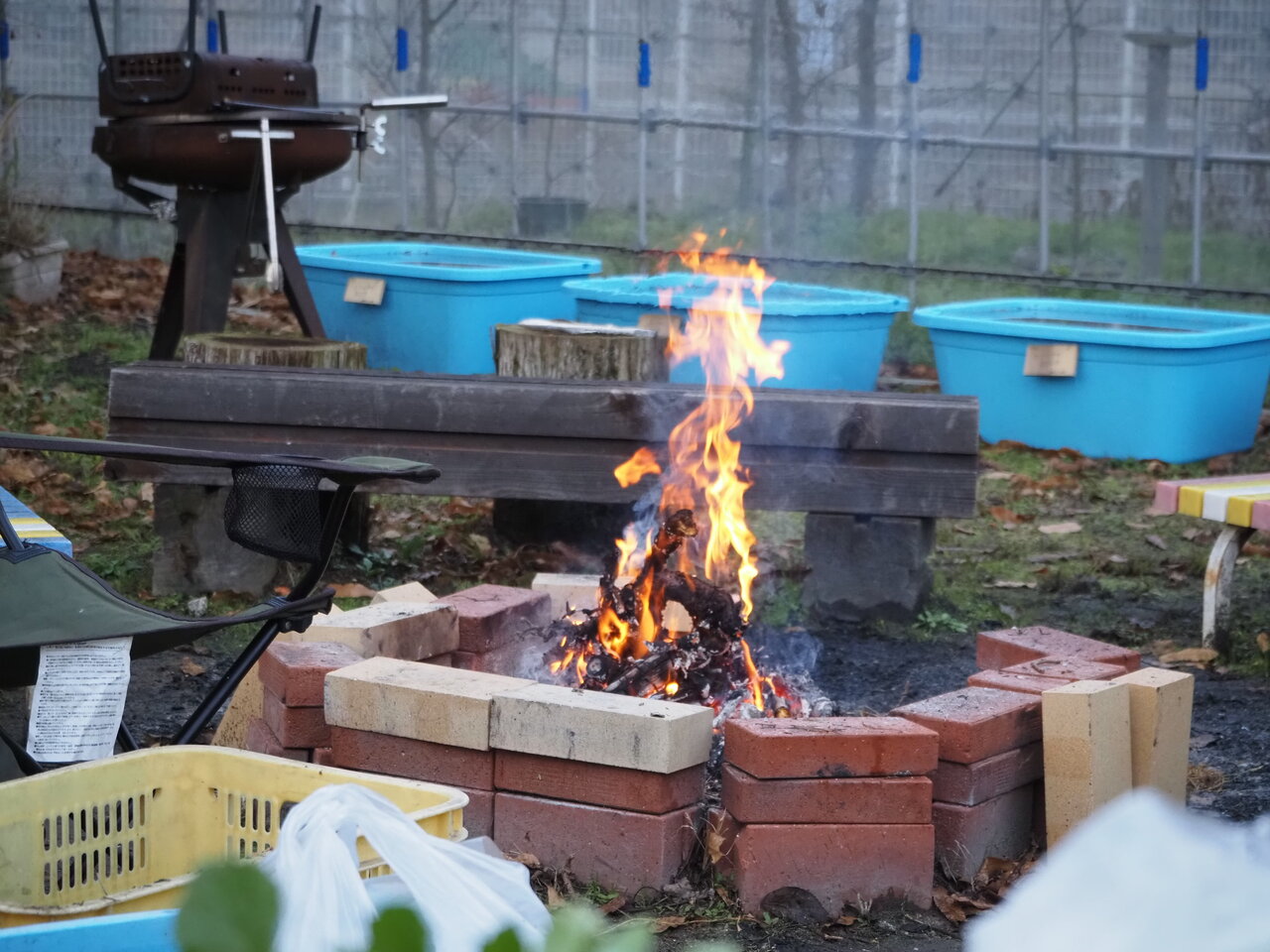 ひっくと、朝から焚火で暖まりつつ