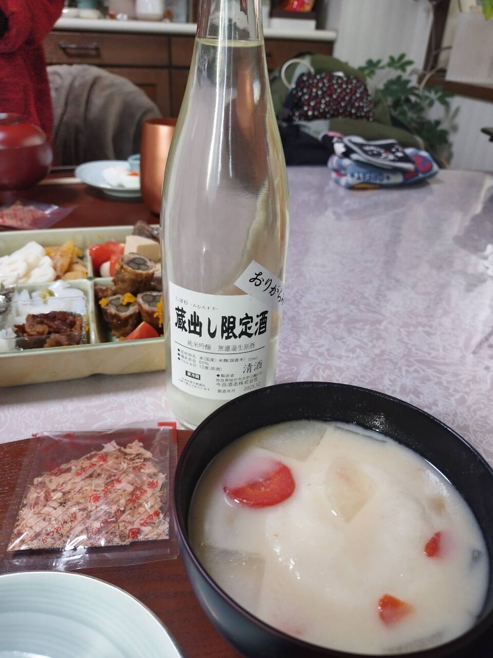 冷凍海鮮などとあわせて、福徳長「純米吟醸」1.8ℓパックまで日本酒もすすみました