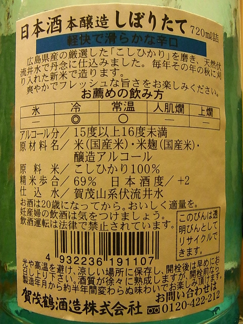 「賀茂鶴」の旬季限定、新米、搾りたての新酒であります。