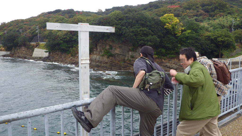 で、最初は仲良く、雨に煙る巨大な積み出し基地跡を見てたのですが・・・