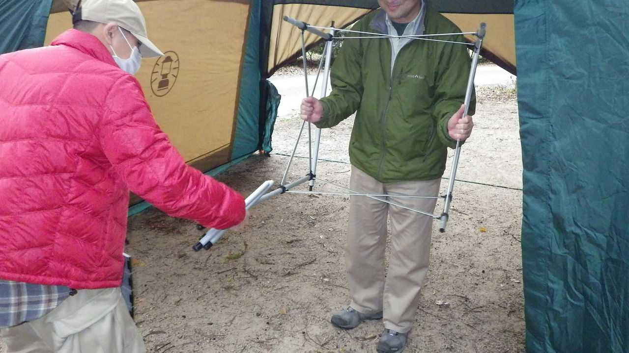 オートキャンプ場の一角で、宴会場、もといタープの設営であります。