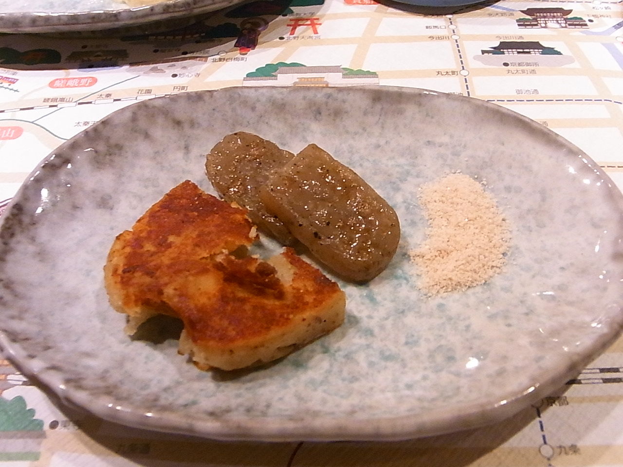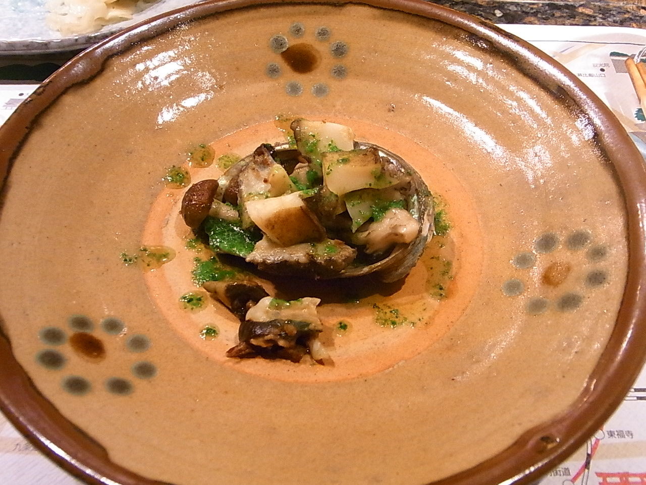 こちらはアワビとシメジでありますね・・・はて、ソースはなんのソースだったっけ・・・ともかくおいしかったです。
