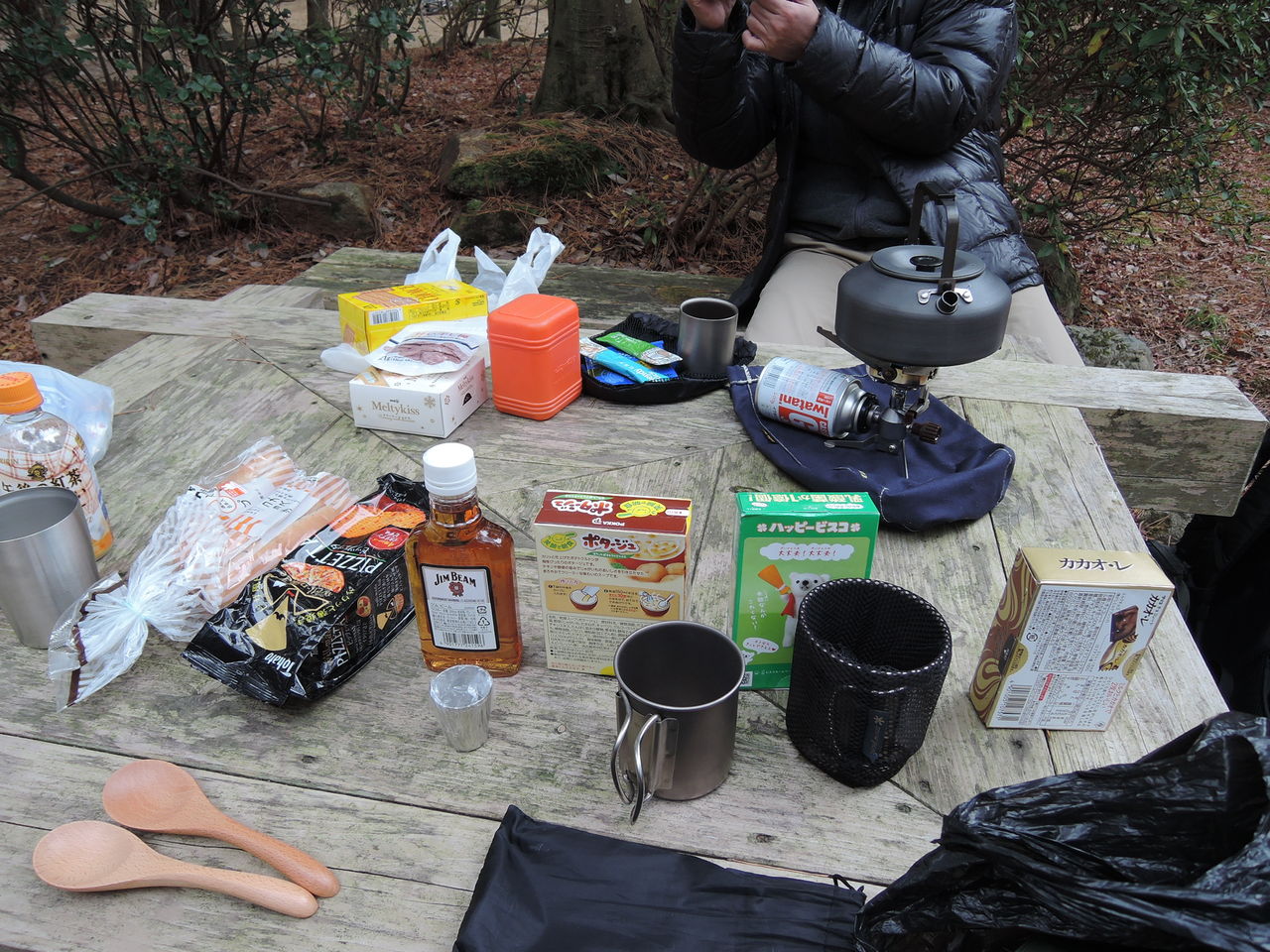 で、そのうしろのベンチで、こそこそと宴会準備をはじめる98kさん・・・