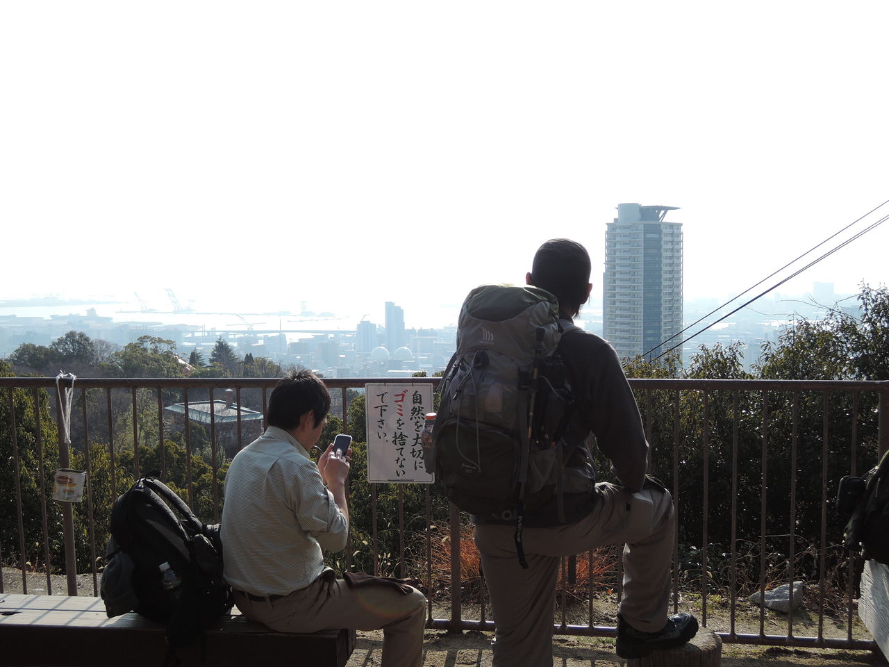 おニューのモノキュラーで神戸港の眺めを楽しむ赤チャリさんと、おニューのタブレットで位置を確認するwingさん。