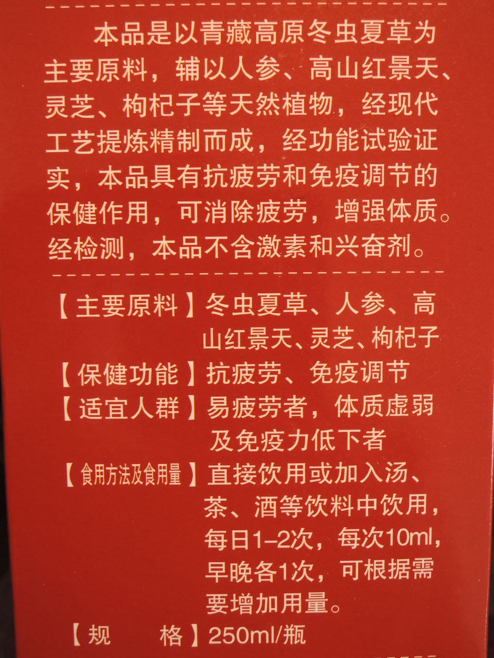 チベット高原の冬蟲夏草が主要原料、一回10mlで一日1~2回となってますが、