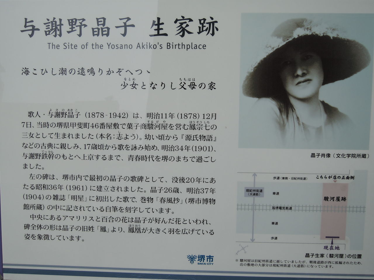 堺市中心部にある、与謝野晶子の生家「駿河屋」跡であります。