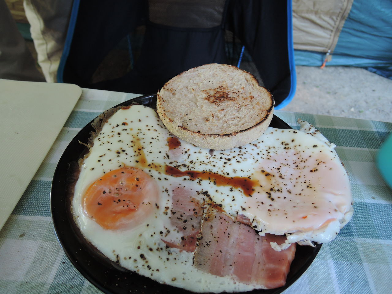 ベーコンエッグ朝定食の完成であります。