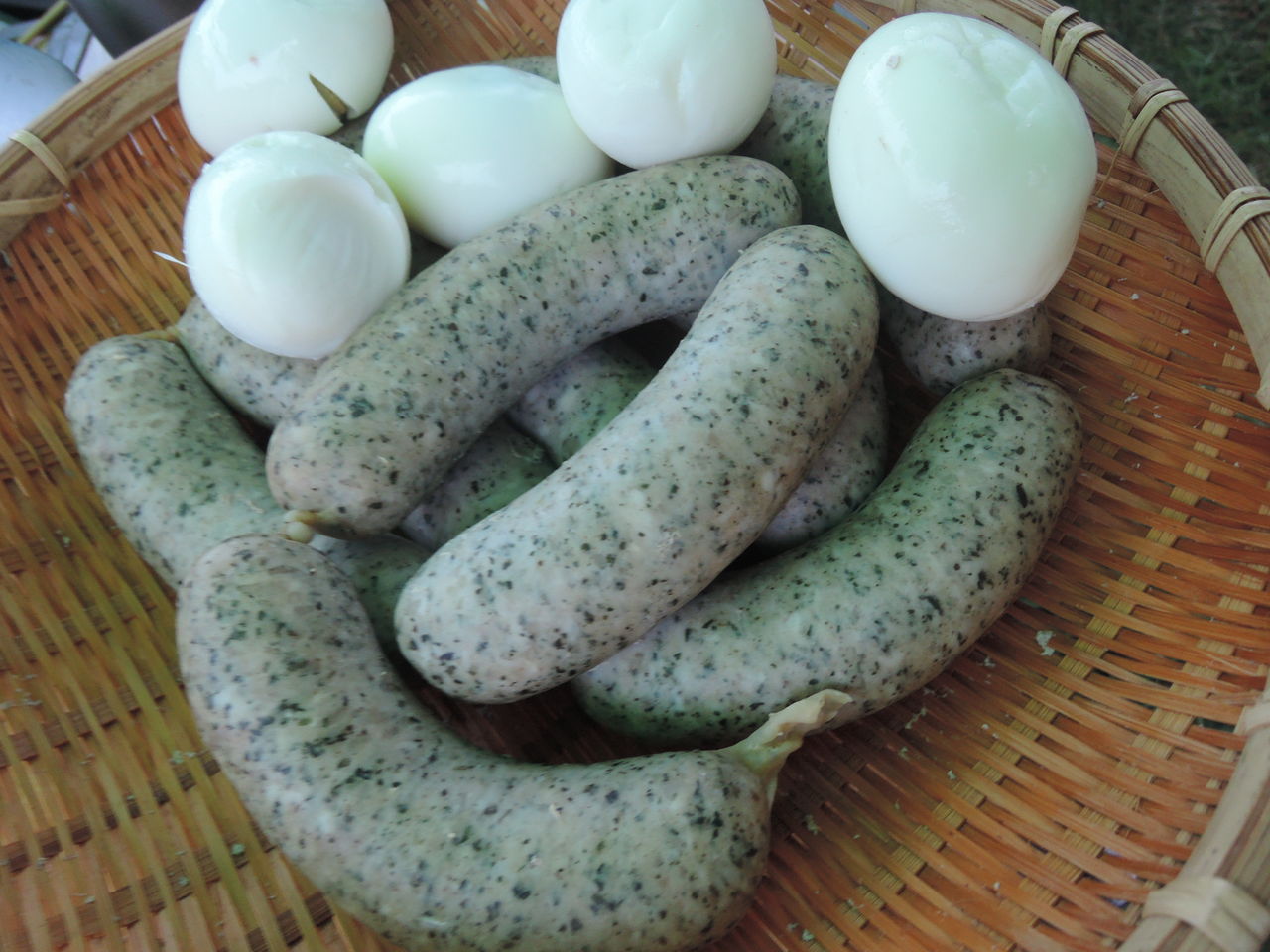 「この巨大ソーセージと卵以外にも練り物もいっぱい・・・なにせ食事前に買い出ししたもので・・・」