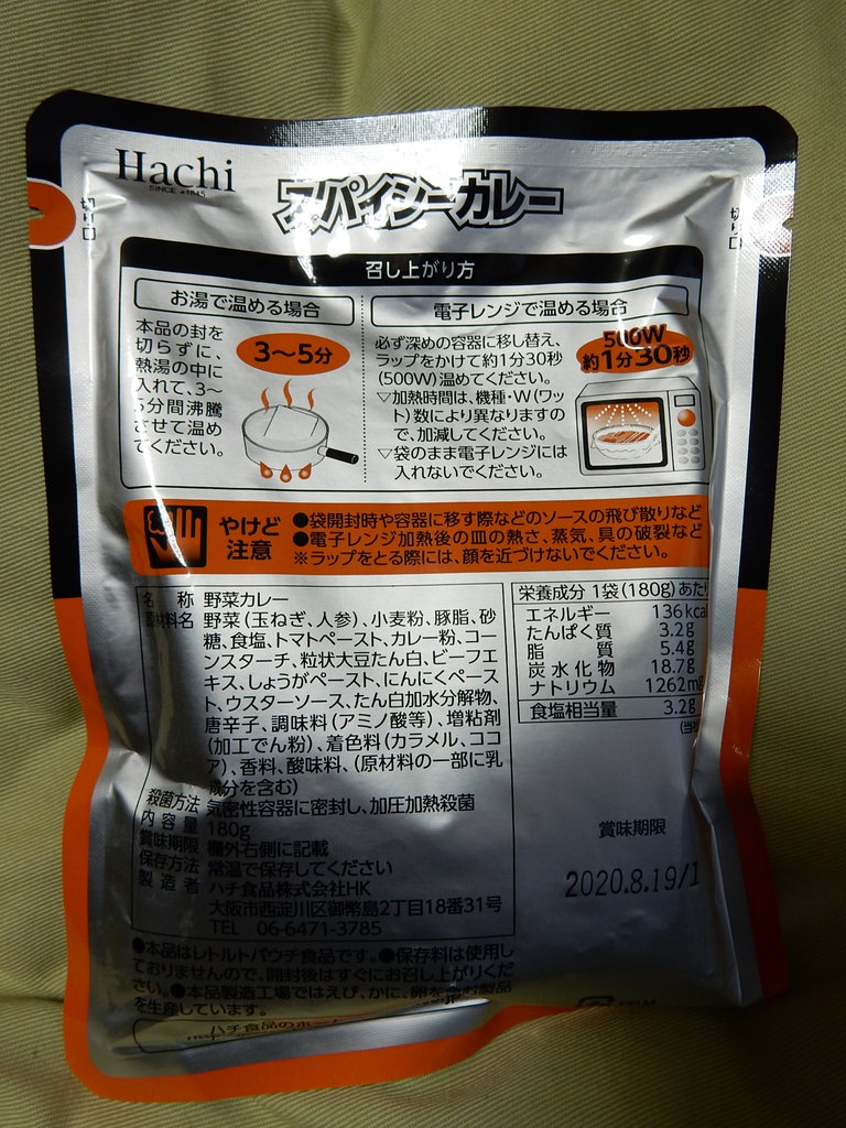 こちらはわたくしもおなじみ大阪市西淀川区にあるハチ食品の「スパイシーカレー(野菜カレー)」