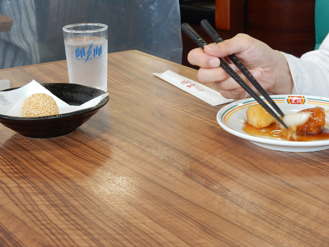 さらに少食な川端さんはジャストサイズの酢豚と餃子3個と胡麻団子1個のみ・・・