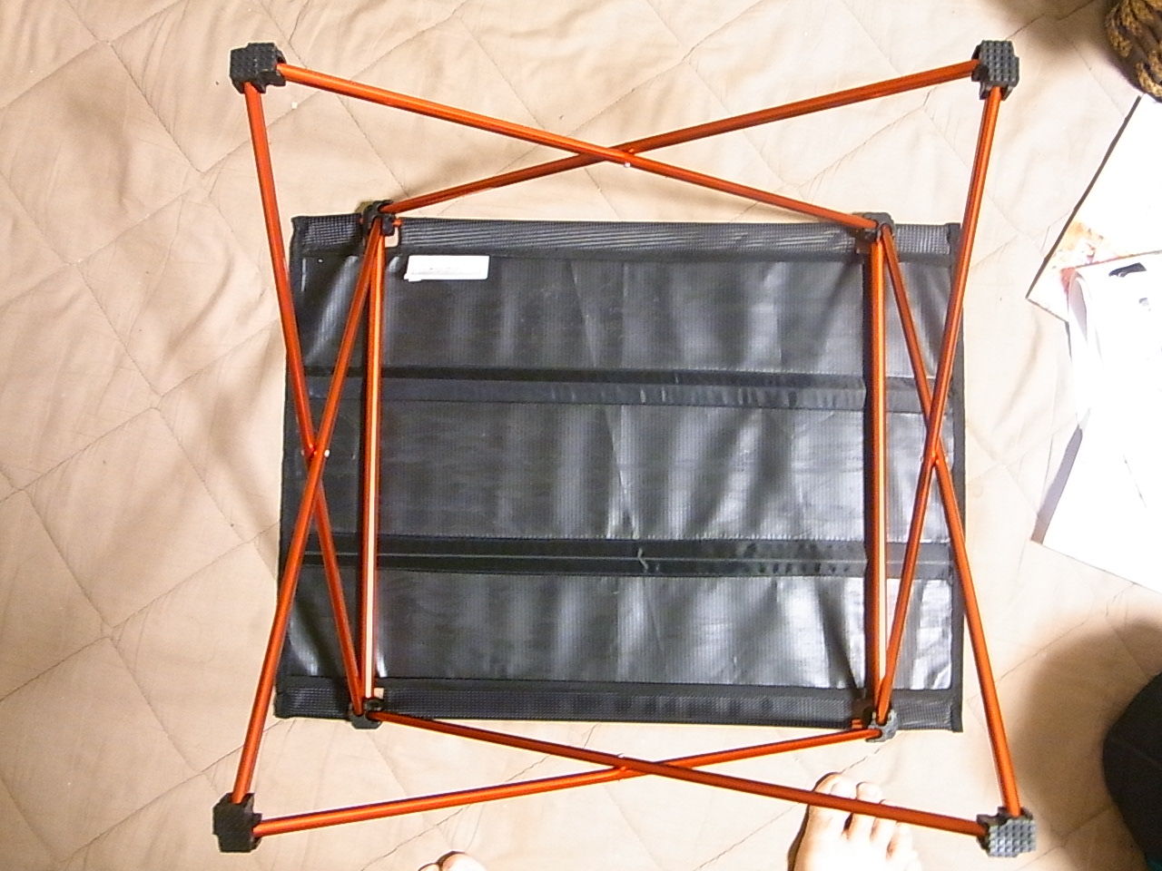 タテ2本、ヨコ4本のフレームで布製の天板を支える仕組みで、静止荷重は20kgになっています。