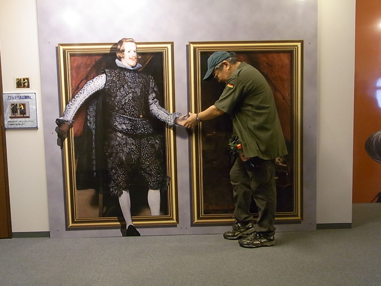すべて平面に描かれたものですが、たとえば左に置いてあるスツールだけが本物で、そこに座ってポーズをとると・・・
