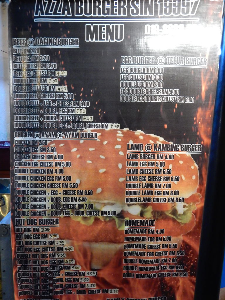 昨夜は左上のビーフバーガー2.2リンギを食べましたが、他にもメニューは豊富。