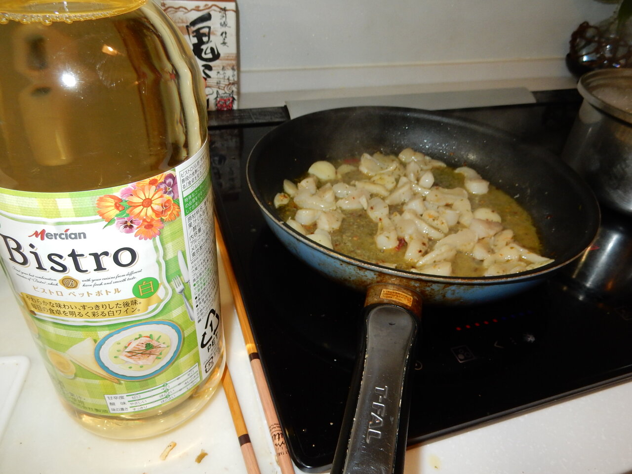 ・多めの塩を入れた熱湯にパスタを投入、あこや貝(の貝柱)を中火で炒めはじめます。