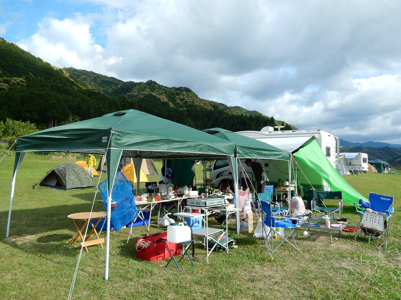 雨が降り出す前にテントやサイドオーニングを張り終えてたそうで、さすがですね・・・