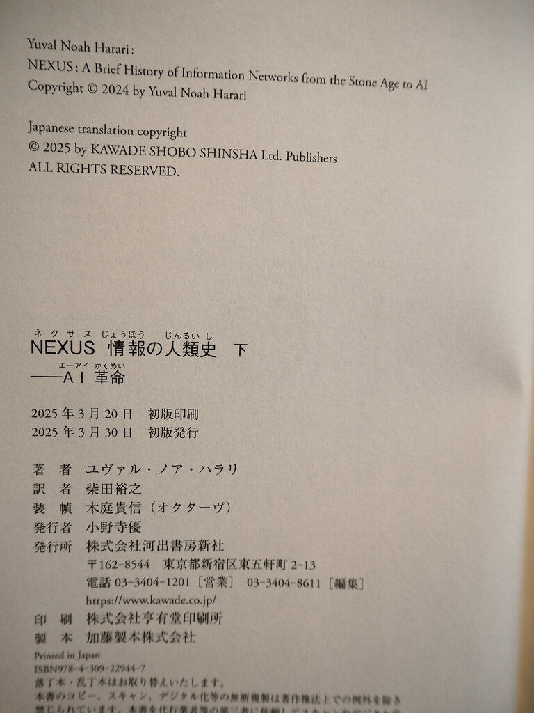 ユヴァル・ノア・ハラリ著「NEXUSネクサス情報の人類史」であります
